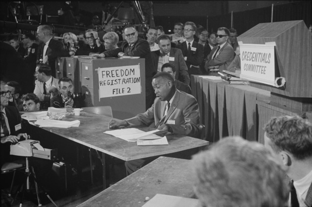 Aaron Henry, chair of the Mississippi Freedom Democratic Party delegation, speaks before the Credentials Committee at the Democratic National Convention, Atlantic City, New Jersey, August 22, 1964. Photograph by Warren K. Leffler. Courtesy of the Library of Congress Prints and Photographs Division, loc.gov/pictures/item/2003688166.