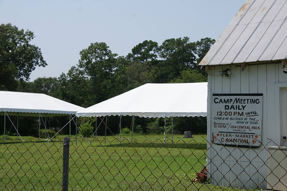 Top, The Big Gospel Tent Revival, Shelby, North Carolina, January 1, 2000. Photograph by Flickr user Brittany Randolph. Creative Commons license CC BY-NC-ND 2.0. Bottom, Camp Meeting buildings and tents, James Island, South Carolina, July 4, 2014. Photograph by Flickr user romana klee. Creative Commons license CC BY-SA 2.0.