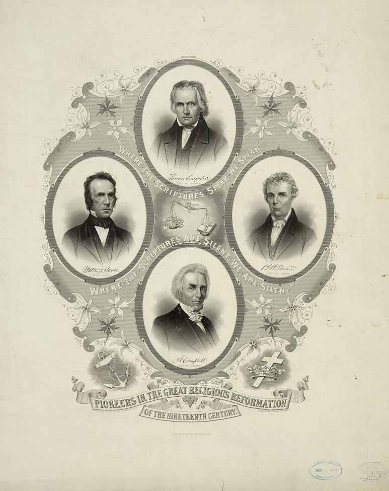 Pioneers in the great religious reformation of the nineteenth century, ca. 1885. Engraving by John Chester Buttre featuring portraits of Thomas Campbell, B.W. Stone, Walter Scott, and A. Campbell. Library of Congress Prints and Photographs Division, www.loc/gov/pictures/item/98508288/.
