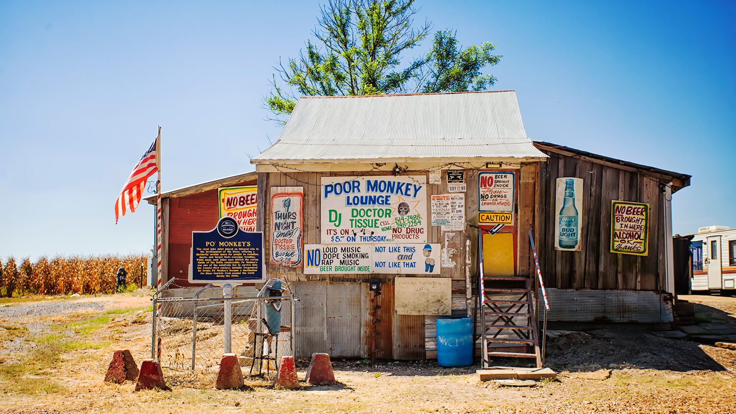 Poor Monkey's sits in a cotton field in Bolivar County, west of the town of Merigold on the Hiter farm, land worked by members of the same family for generations. Monkey's is the only surviving sharecropper shanty on this land, although there are remains of a few others nearby. In the early 1950s, Willie Seaberry, known as Poor (Po') Monkey, began to operate the unused sharecropper house as a lounge.