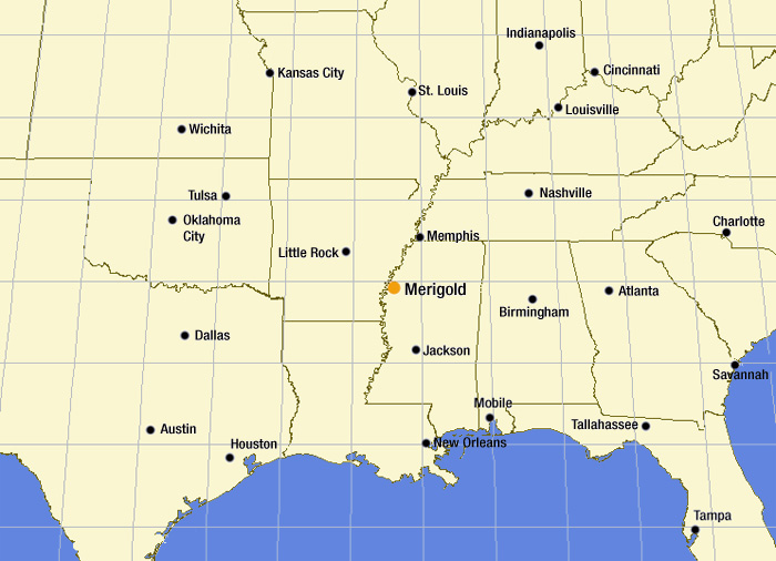 Sarah Toton, Map of U.S. South emphasizing Merigold, Mississippi, 2006.