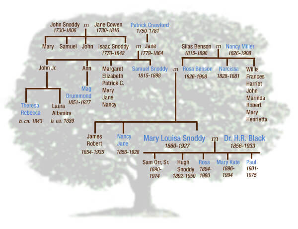 Patrick Crawford (1750-1781) was the great grandfather of Mary Snoddy Black. He and his family immigrated from Ireland to the Tyger River area in northern South Carolina with his wife and children. Crawford fought on the Patriot side of the Revolutionary War until, in 1781, he was mistakenly shot and killed by a friend during a scouting mission.
