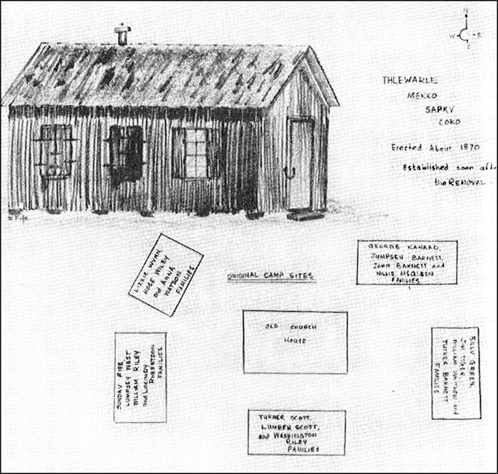 In 1914, Thlewarle was rebuilt. The old church was not torn down until 1959.3All illustrations in this article are prints of the original drawings by Jimmie Carole Fife, a sister of Sharon, and daughter of Mr. James and Carmen (Griffin) Fife. This young artist has her B.A. degree in Fine Arts from Oklahoma State University (1963). She is now a teacher in the public schools in Dustin, Oklahoma. She has continued graduate work in art and her paintings have been shown in well-known Indian Art Exhibits in Oklahoma, New Mexico and Arizona. It was built—as is traditional for all Creek churches—facing east. It is believed that when Hesaketumese {Hesaketvmese} (Christ) comes, he will come from the east with the sunrise. One very different thing about Thlewarle is that there is no sign of a cross on or inside the church house.