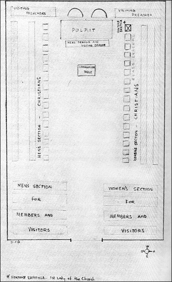 The seating arrangement in the church is as follows. The pastor is seated behind the pulpit. All preachers attending are seated at the front wall of the church. The Christian men sit on the south side of the church and the Christian women on the north. The class leaders sit in the first seven chairs from the pulpit on the women’s side. On the fourth and eighth Sundays, the head deacon and the visiting deacon sit in a long chair in front of the pulpit. The head deacon sits in this chair at all meetings.5In 1919 this chair was donated to the church by the Reverend Sunday Fife. The back rows of the church are for the visitors and members.