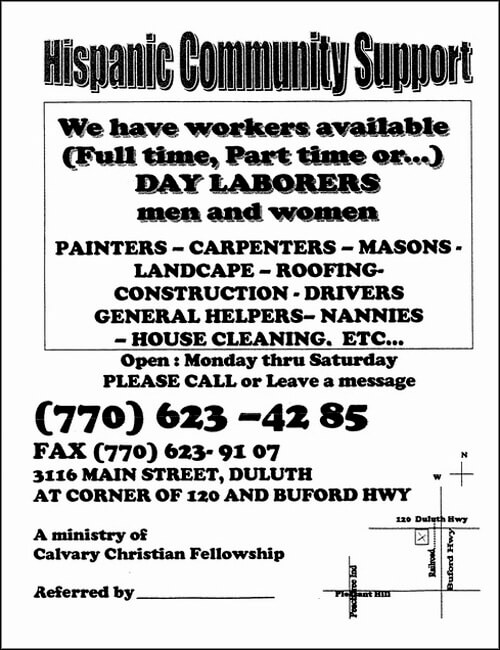 Carlos Marín experienced non-payment of wages when he sought work at a street corner. In 2002, he and his brother worked for someone for a week, but they were not paid for their labor. Carlos saw the person at the corner again when he was picking up other workers. The brothers asked the man for their money, but he would not pay them. Following this incident, they turned to Calvary Christian Fellowship for help and then began waiting for work at the hiring hall.28Carlos Marín [pseud.], interview by author, interpreted by Sarah Johnson, tape recording, Duluth, GA, 29 July 2003. In general, hiring halls do whatever they can to secure unpaid wages, but they are not always able to do so.