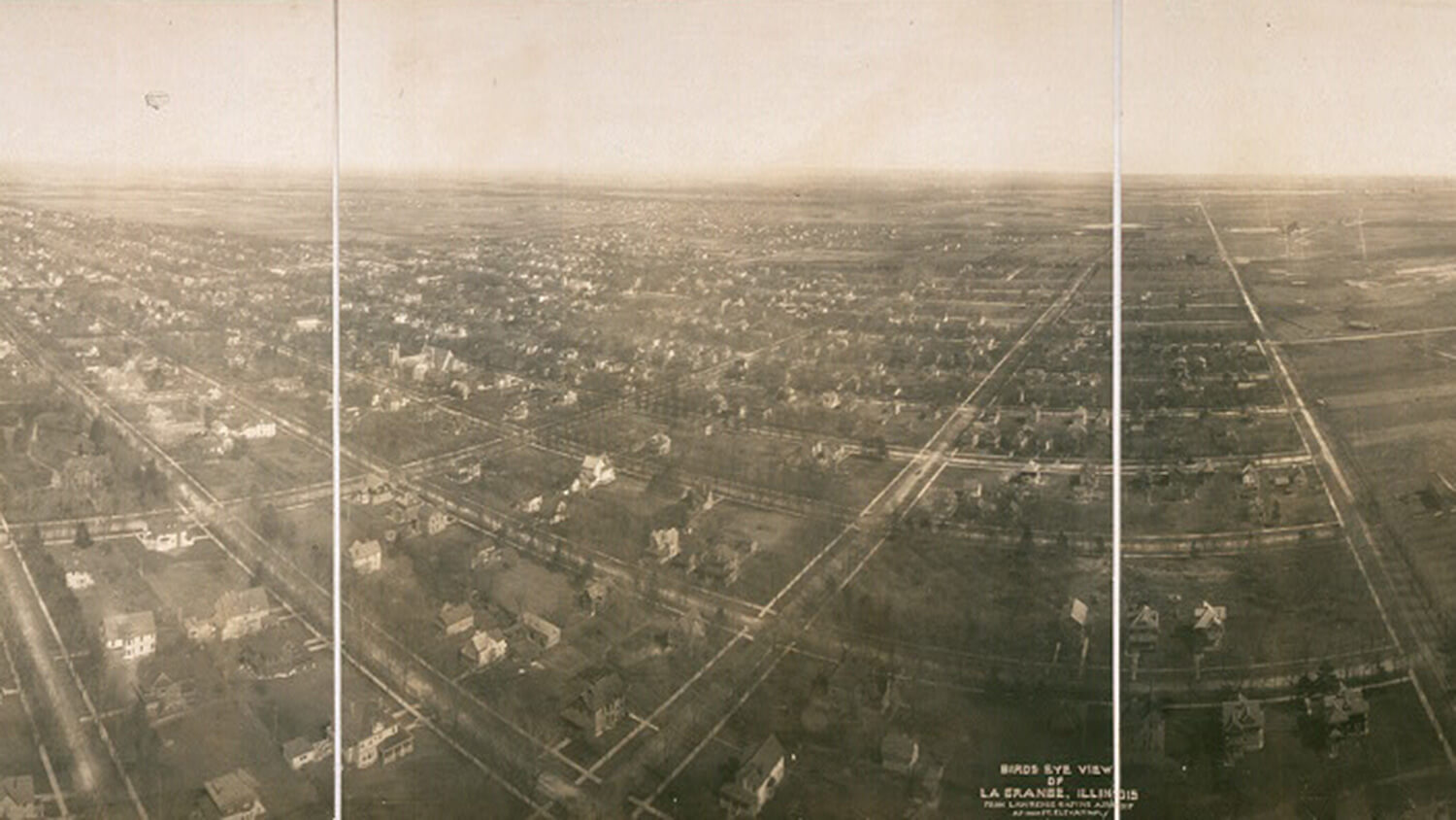 The image of the United States that Stein and her contemporaries grew up with emphasized above all else the clear linear demarcation of national, state, and county borders (as in the 1901 map of the US above). Flying over Illinois on her lecture tour of the country in 1934, Stein was delighted by the very different kind of image—in some ways quite different from the standard cartographic one—that filled the eye all the way to the horizon (as in the 1908 aerial panoramic photograph of LaGrange, Illinois, below). Google Maps makes it easy to toggle back and forth between the print-style map and the satellite photo of "the same" landscape. Courtesy of American Memory, Library of Congress.