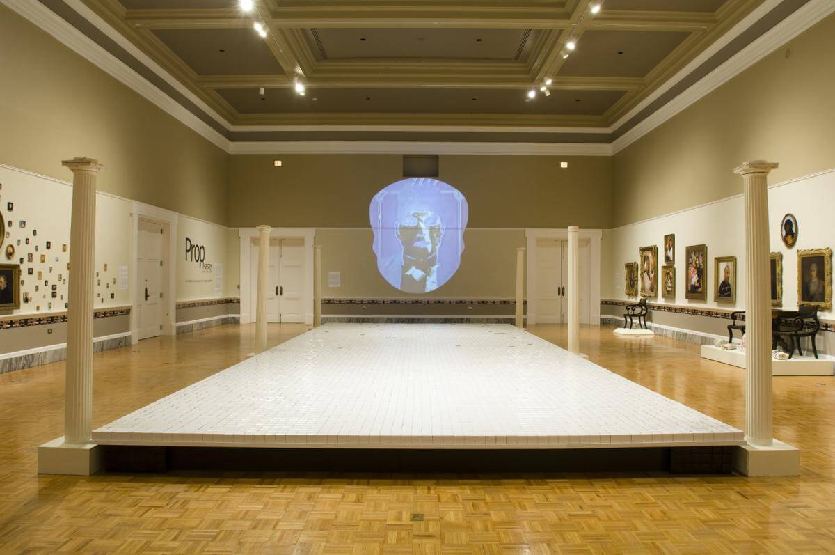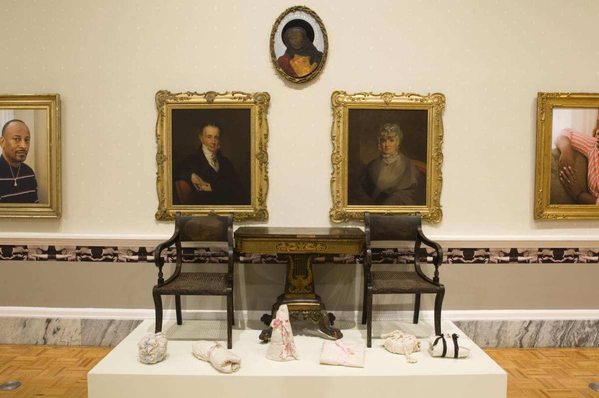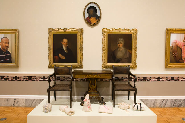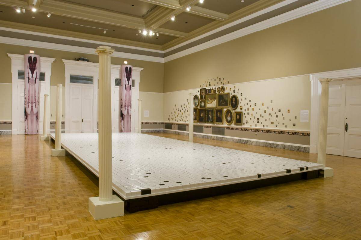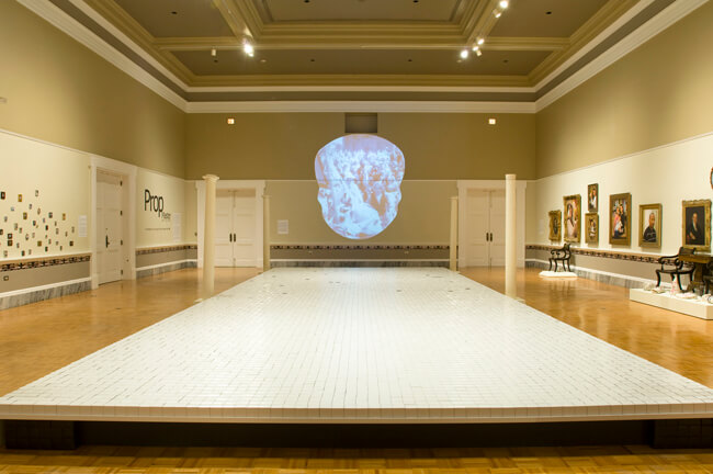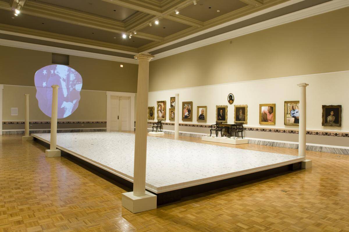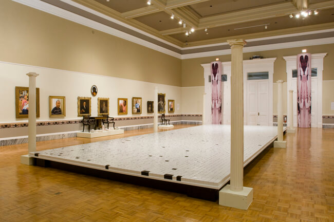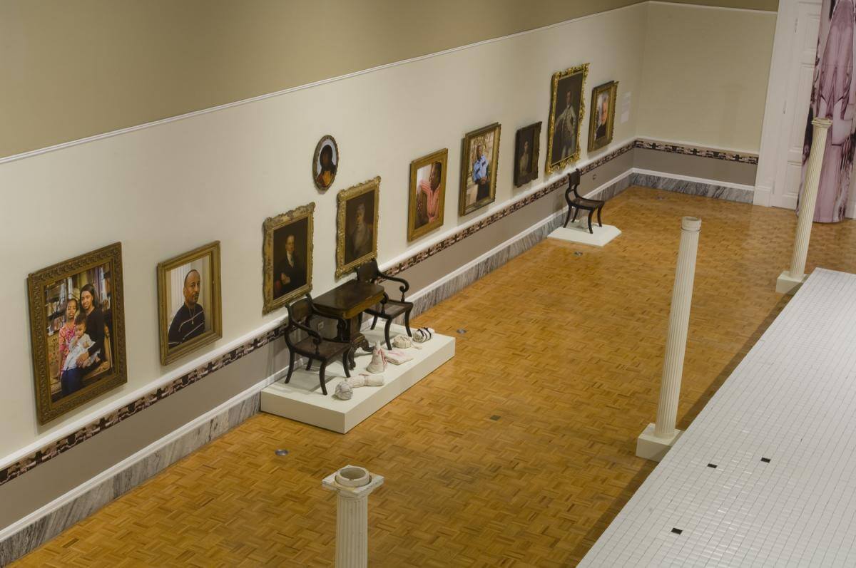 Strategically centered in the gallery, Prop Allocations or Accents for Gracious Living signifies the museum as institution and microcosm of Charleston society, and explores its status as a social self-portrait. The shape of Juan Logan and Susan Harbage Page's installation mirrors that of the gallery in order to comment on how culture — rituals, codes, manners, and customs — is supported and sustained by the museum as a prop master, with works of art as the props to stage a particular portrait of society.