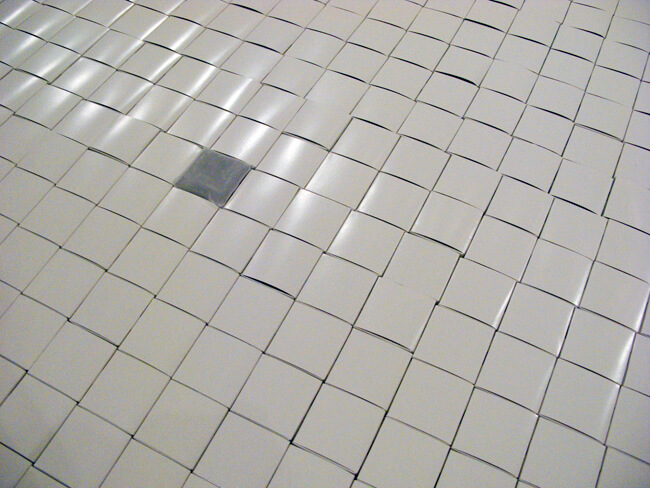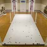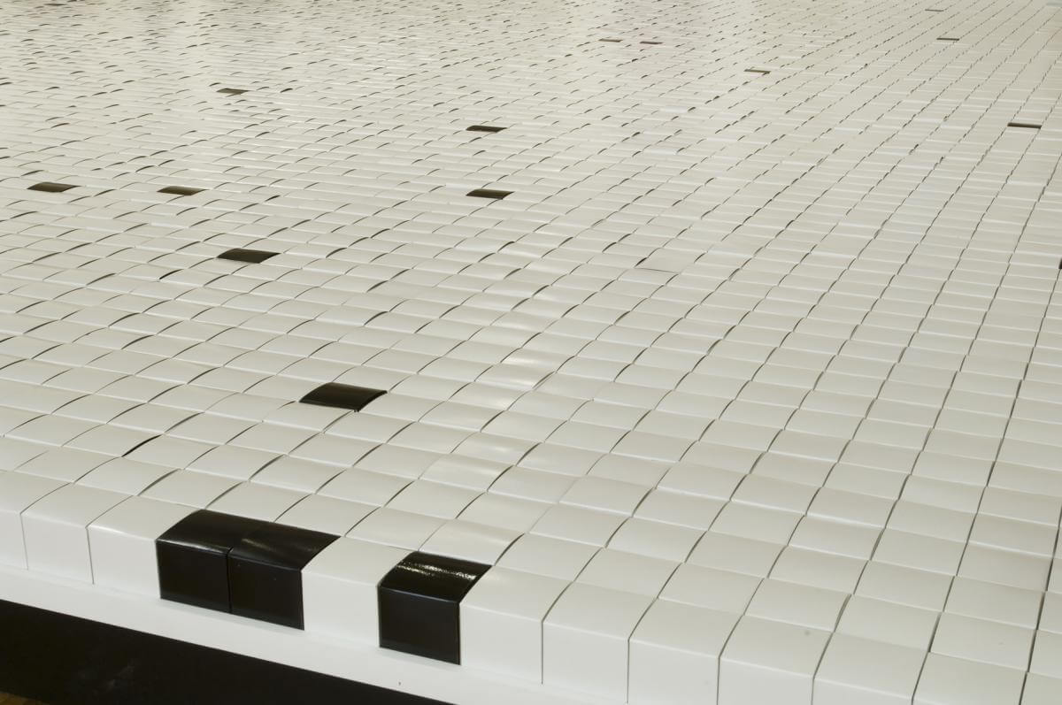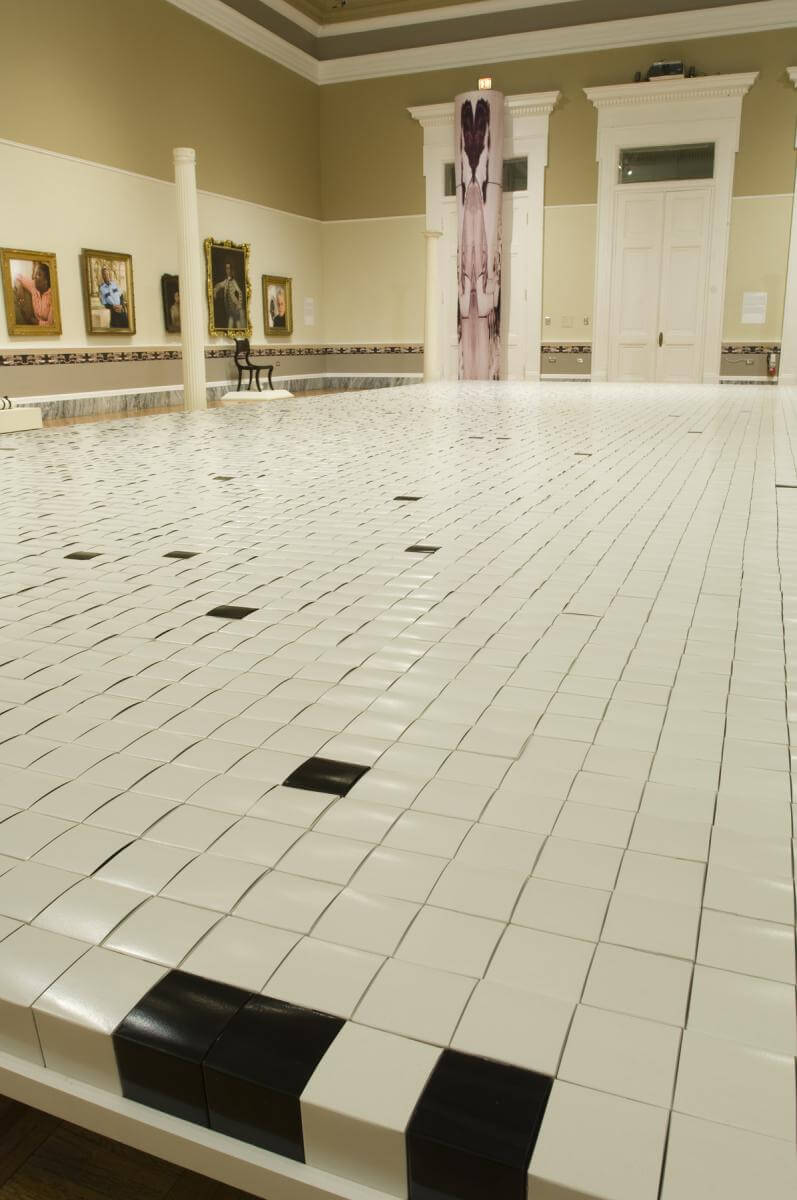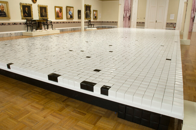 The platform holds ten thousand boxes. These boxes represent the ten thousand works that comprise the collection of the Gibbes Museum of Art, largely society portraits, landscapes, and miniatures. Interspersed among the white boxes are forty black ones. These signify the only works in the collection created by African Americans, works which were acquired recently or entered the collection accidentally. The boxes are laid out as a rough timeline based on the museum's years of operation, and when particular pieces by African-Americans were added. The end of the platform close to the pink columns is the beginning of the timeline and the other end concludes with the four pieces by African Americans which were added to the collection in 2008. The veiled box refers to the first work (in 1943) by an African American artist to become part of the Gibbes' collection: Claude Clark's Old Swede's Church, 1940. Only long after its accession did it become known that its printmaker was African American. The stacked rows of small black boxes that support the platform suggest the unacknowledged role of African Americans in upholding this culture and sustaining its economic structure.