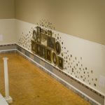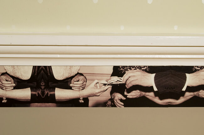 Page's Background Material: Chair Rail Frieze also appropriates and transforms an archival photograph to consider how women sustain social customs, mores, and values. Following the chair rail around the gallery, separating exhibition wall space from that below, Page's frieze shows mirrored iterations of a cropped and abstracted photograph. The photograph, selected from the Gibbes Museum archives of images from past openings, depicts a well-dressed woman's hands, delicately serving cookies, which a man's hands content/edly take. Tracing the room, the replication of the image indicates how such actions have recurred innumerable times and how they continue into the present.