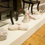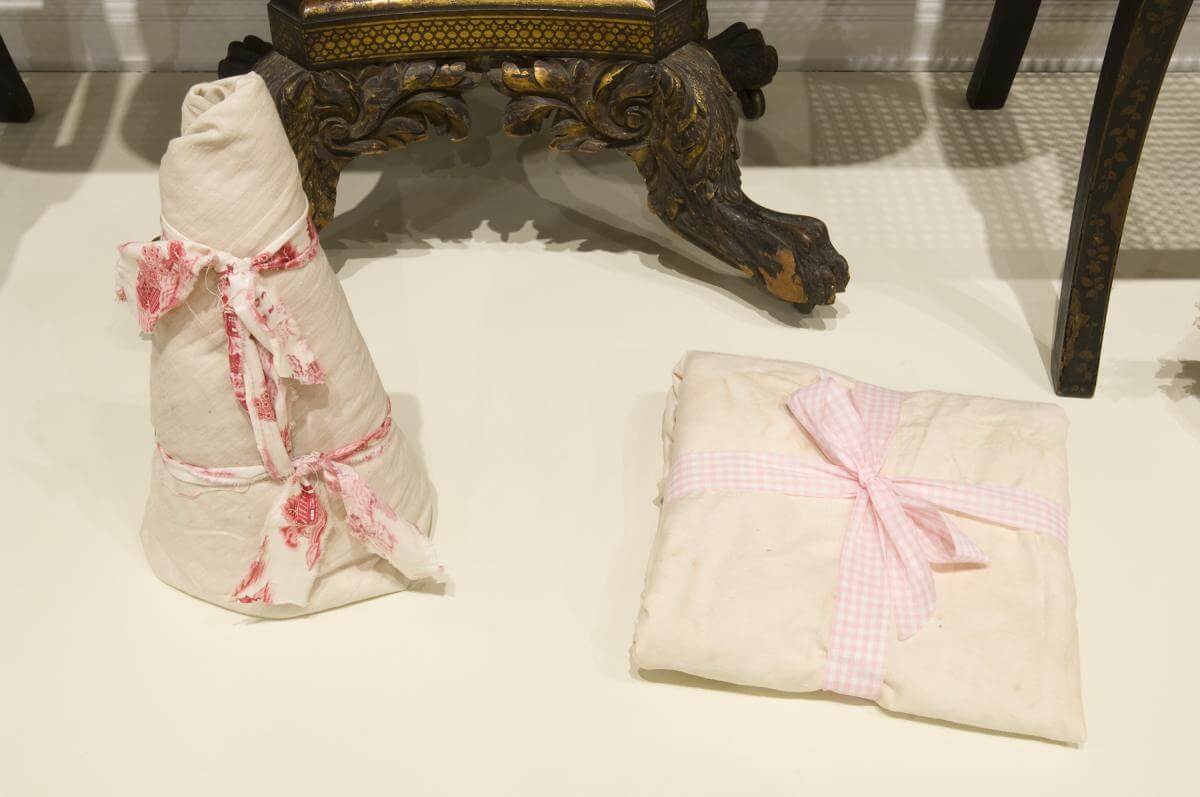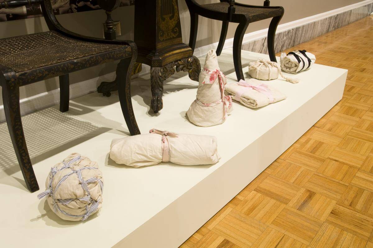 To tie such activities to the slave past and the plantocracy, Page presents the bundles on elegant period furniture: a table from the Charleston Museum and four matching chairs from the Joseph Manigault House. These luxurious objects once belonged to the family of Charles Pinckney, a wealthy Lowcountry planter and signer of the United States Constitution. Pinckney owned hundreds of slaves who worked on his numerous rice and indigo plantations, as well as at his Charleston home on Meeting Street. As a reminder that racism persists in many guises, even as it changes form, Page's installation links the slave past to the Jim Crow era and to the present. Provocatively, the attractive shapes of the bundles refer to decorative schemes extolled in magazines such as Southern Living or Martha Stewart Living. Displayed on platform risers painted in the color Lancaster Whitewash, the uniforms and furniture are propped up by whiteness in the literal and metaphorical senses.