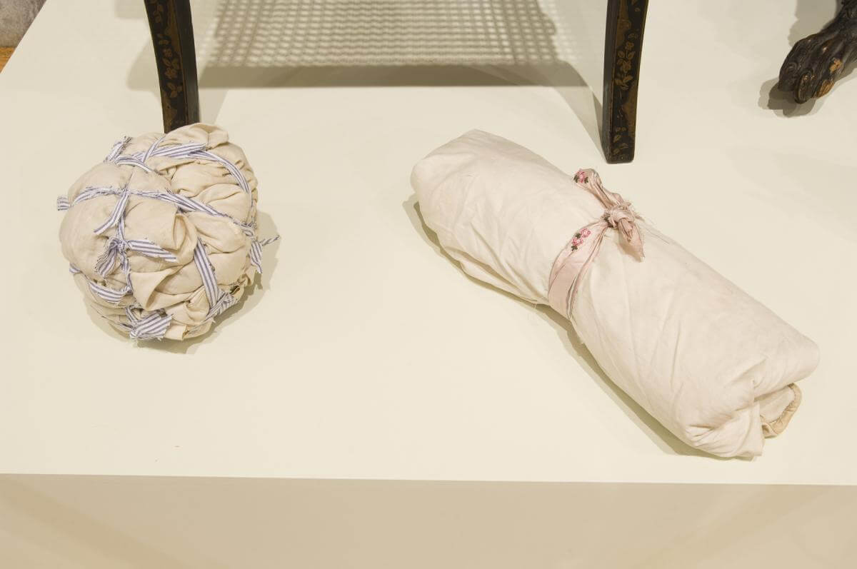 Eight variously shaped bundles, formed from Ku Klux Klan uniforms from 1920s South Carolina, make up Susan Harbage Page's Expressions of Affection. Attractive fabric strips and ribbons hold each bundle in shape, with the exception of one tied with an actual rope belt worn with Klan robes. The belt's resemblance to that worn by monks suggests how Klan members viewed themselves as a brotherhood with a mission or vocation. Ties made from pink silk fabric, seersucker, or pink and white ribbons implicate women in Klan activities: sewing hoods and gowns, as well as cleaning, pressing, storing, and treasuring them.