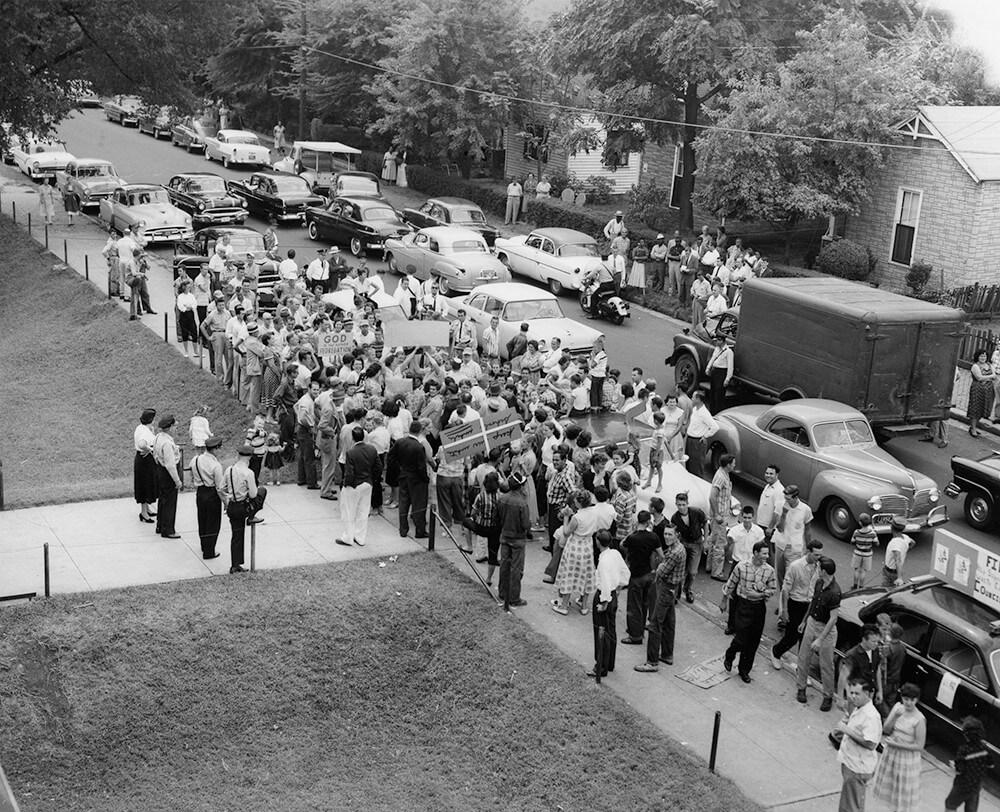 Protesters in the street on the day Nashville schools were desegregated, Nashville, TN, September 1957. © Nashville Public Library.