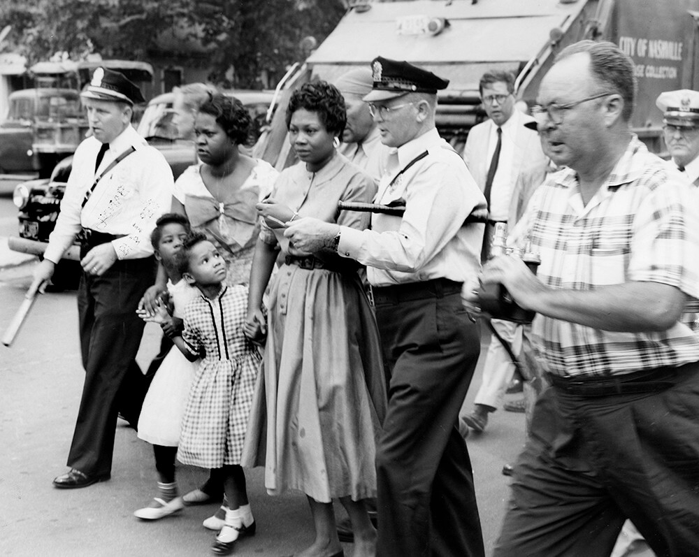 Police arrest a demonstrator, Nashville, TN, September 1957. © Nashville Public Library.​​Young demonstrators throw bottles, Nashville, TN, September 1957. © Nashville Public Library.​​A young demonstrator wields a rock. Nashville, TN, September 1957. © Nashville Public Library.​​
