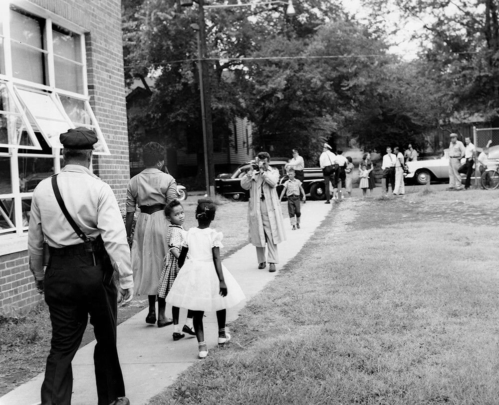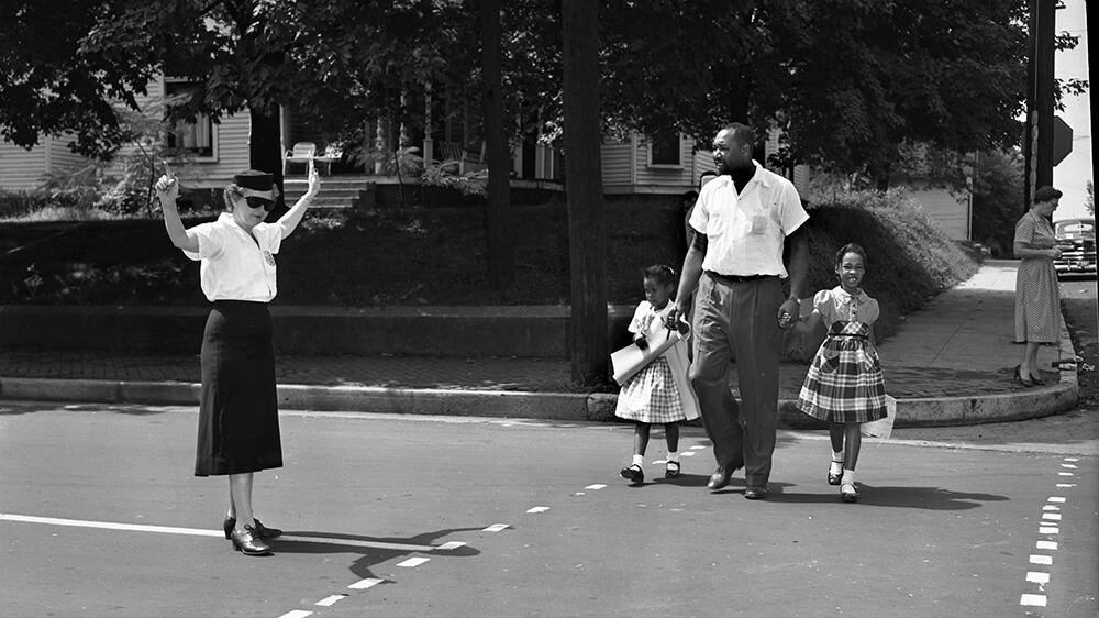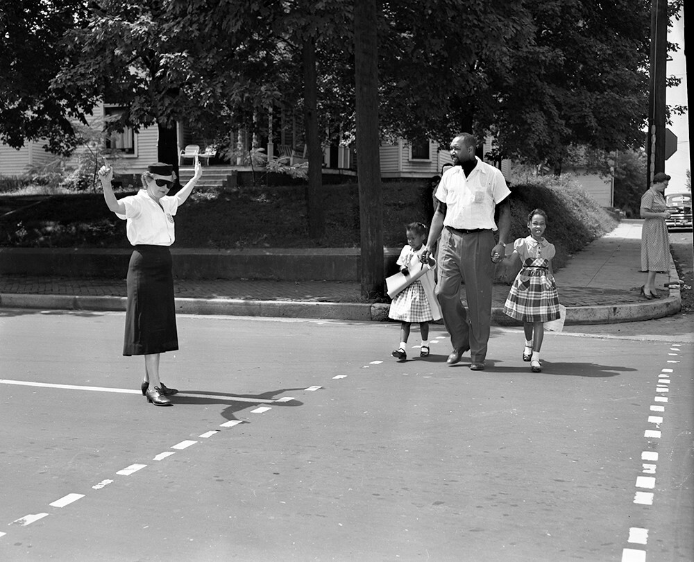 Harold Street walks his daughter Lajuanda (right) and Jacqueline Griffith (left) to Glenn Elementary School, Nashville, TN, September 1957. © Nashville Public Library.​​
