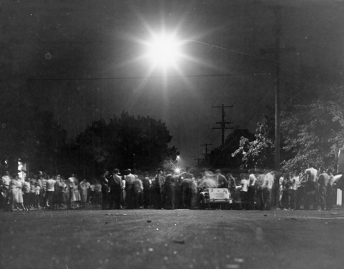 Crowd in the street near Hattie Cotton after the bombing, Nashville, TN, September 1957. © Nashville Public Library.​​