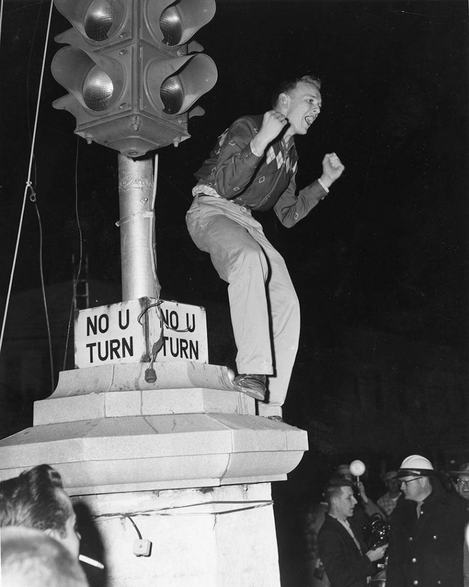 A demonstrator shouts from a traffic light post, Nashville, TN, September 1957. © Nashville Public Library.​​