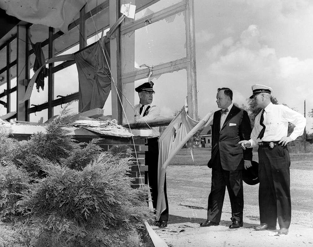 An officer displays a clock stopped at the time of the bomb blast, Nashville, TN, September 1957. © Nashville Public Library.​​