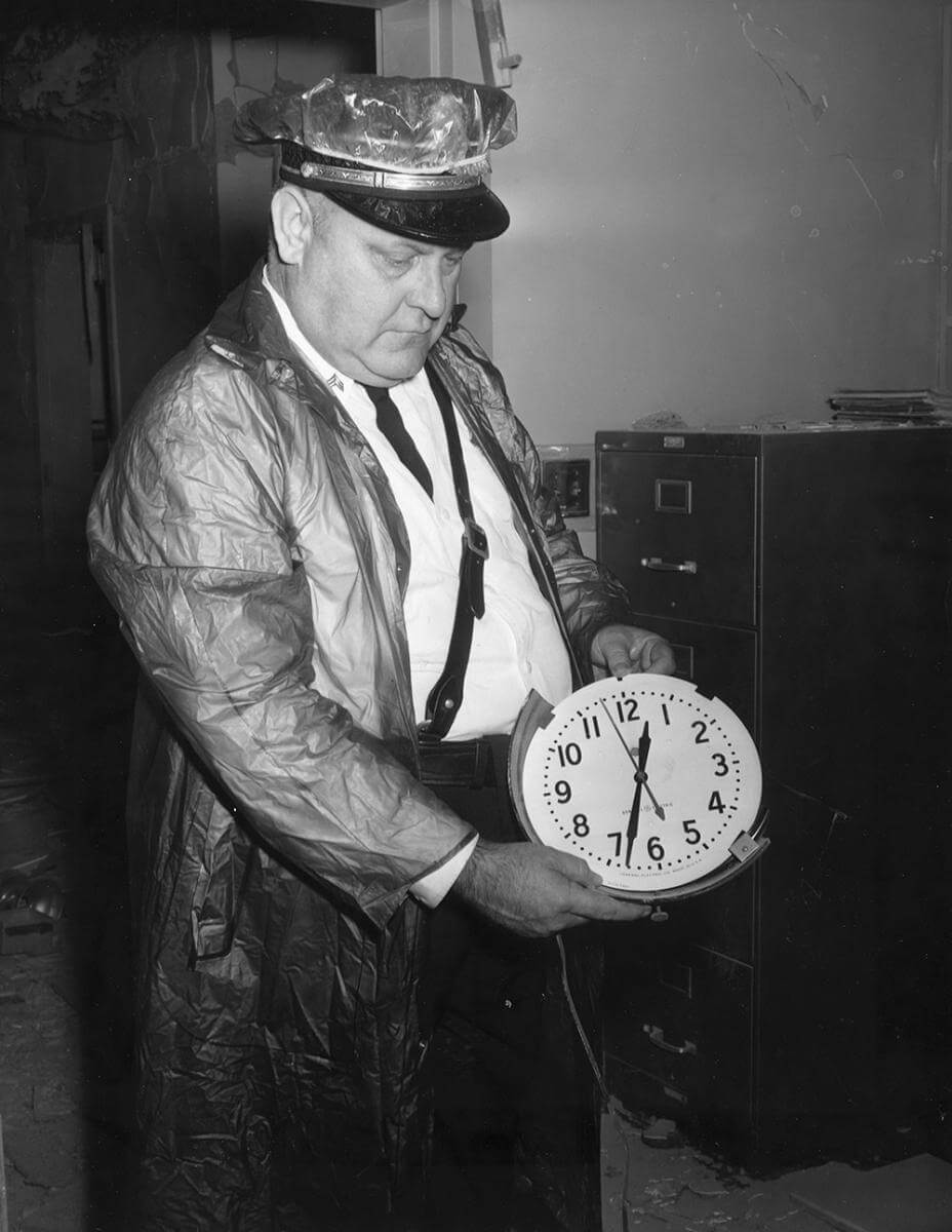 An officer displays a clock stopped at the time of the bomb blast, Nashville, TN, September 1957. © Nashville Public Library.​​