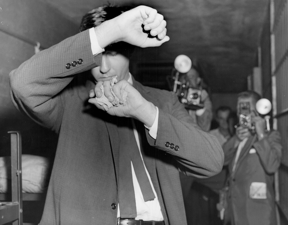 Arrested, John Kasper shields himself from photographers, Nashville, TN, September 1957. © Nashville Public Library.​​