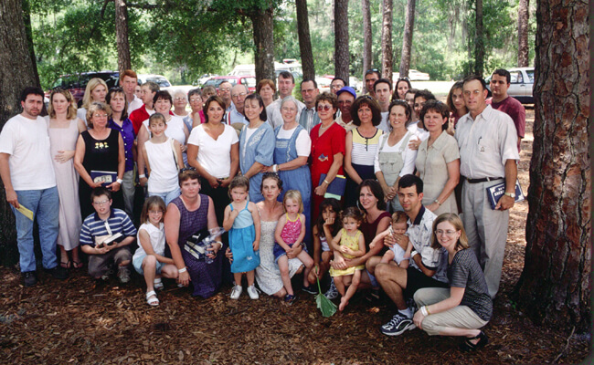 | Members of the Lee Family pose at Stephen Foster Folk Culture Center State Park, White Springs, Florida, after the Silas Lee Memorial Sing at the 2000 Florida Folk Festival. Photo by Laurie Kay Sommers, courtesy of South Georgia Folklife Collections, Valdosta State University Archives and Special Collections of Odum Library. |