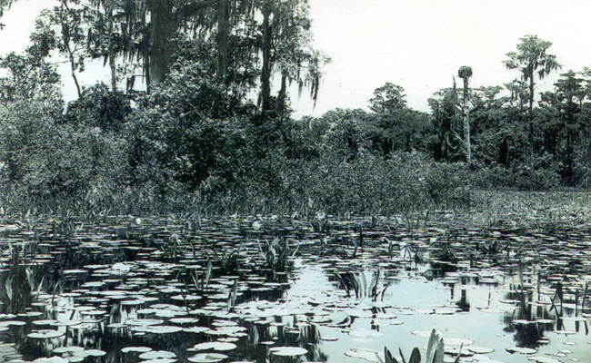 | Cypress head and water liies on Chase Prairie, Okefenokee Swamp, May 1912. Photo by Francis Harper, courtesy of Delma Presley. |