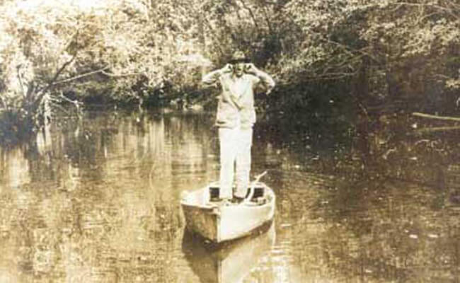 | Hamp Mizell with his two-mile swamp holler, Okefenokee Swamp, 1930. Photo by Francis Harper, courtesy of Delma Presley. |