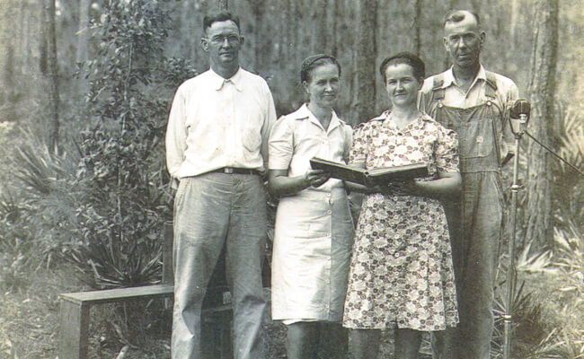 | Members of the Robert Allen Chesser family sing Sacred Harp on the porch, Chesser’s Island, Okefenokee Swamp, 1922. Photo by Francis Harper, courtesy of Delma Presley. | From left; the “Chesser Quartet” of Harry Chesser, Kate Chesser Rider, Roxie Chesser Renshaw and Tom Chesser, making Sacred Harp recordings for Francis Harper, Chesser’s Island, Okefenokee Swamp, August 20, 1944. Photo by Francis Harper, courtesy of Delma Presley. |
