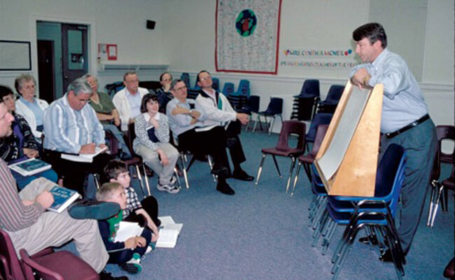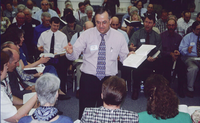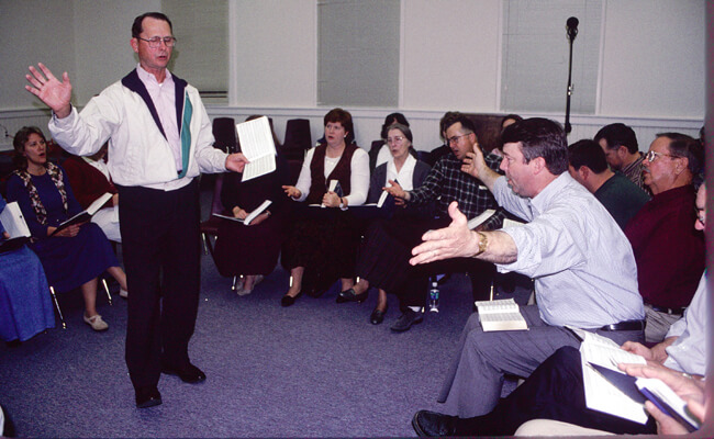 Organizers of conventions across the country and in England invited Lee Family members to lead singing schools on "Hoboken style." Inviting traditional singers to lead singing schools is not new for many northern Sacred Harp conventions, but it was new for the Lees. "We were asked about our style of singing,” says Johnny Lee, “how did we do it, could we show or teach them, etc. and we were at a total loss to understand. We weren't doing anything but singing."65D. Johnny Lee, electronic mail correspondence with Laurie Kay Sommers, 14 October 1999. Through interactions with singers across the country, David Lee became an articulate spokesman for his singing community. Since Sacred Harp network singers are already good singers, these out-of-town singing schools are tutorials of memory, place, and Sacred Harp tradition through story and song. Lee infuses his singing schools with personal experience narratives of growing up in a Sacred Harp singing family and community.
