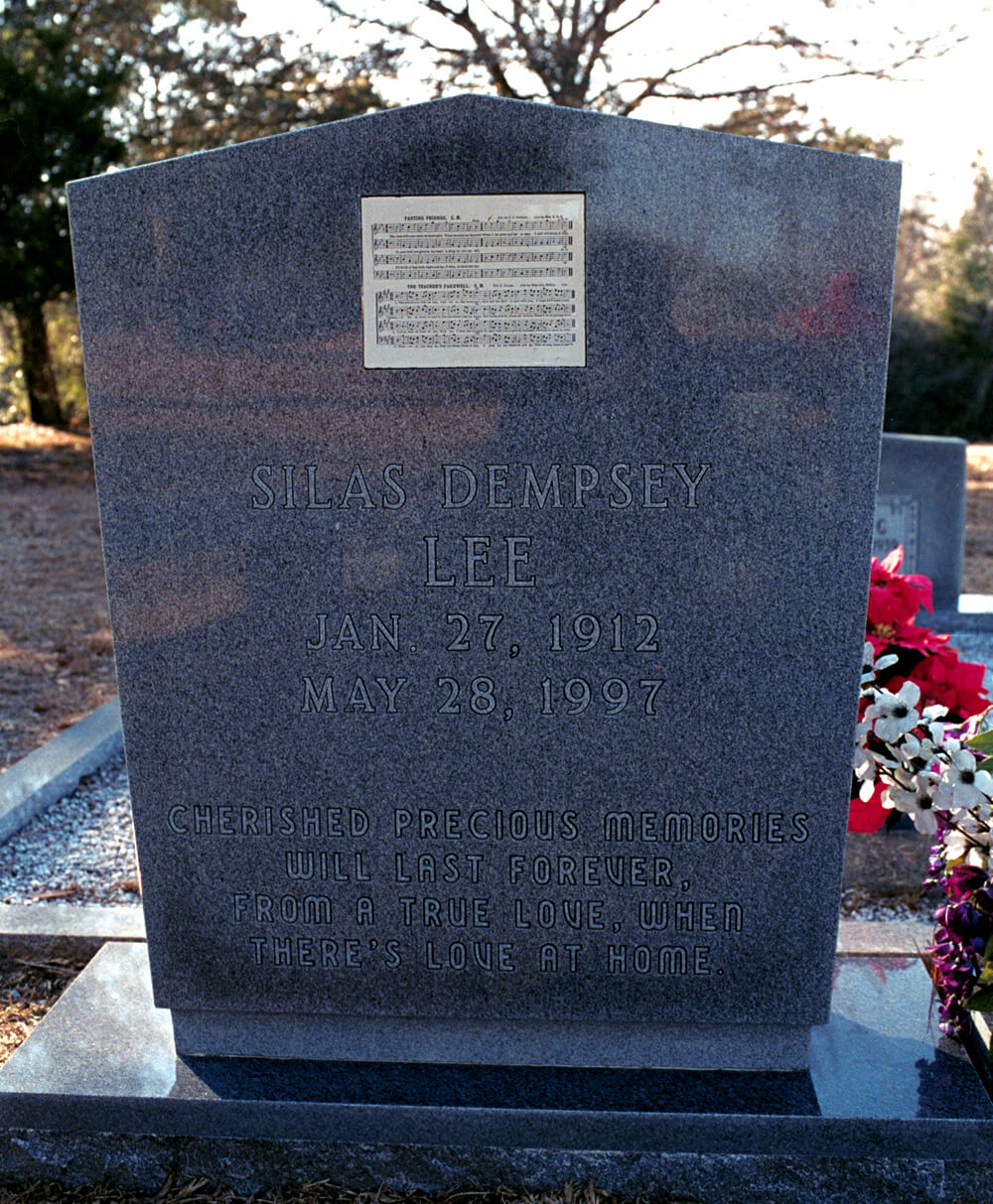 | Grave marker of Silas Lee with Sacred Harp notation and lyrics, High Bluff Primitive Baptist Church Cemetery, Brantley County, Georgia, date unknown. Photo by Laurie Kay Sommers, courtesy of South Georgia Folklife Collections, Valdosta State University Archives and Special Collections of Odum Library. |