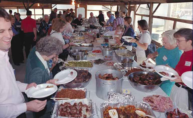 | Dinner on the Grounds at Mars Hill Primitive Baptist Church, Hoboken, Georgia, during the Tri-State Sacred Harp Convention, October 14, 2000. Photo by Laurie Kay Sommers, courtesy of South Georgia Folklife Collections, Valdosta State University Archives and Special Collections of Odum Library. |