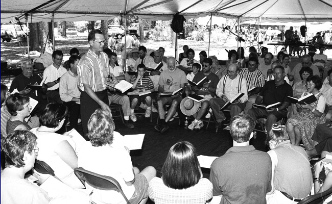 | D. Johnny Lee leads at the Silas Lee Memorial Sacred Harp Sing, Florida Folk Festival, White Springs, Florida, 2000. Photo by Laurie Kay Sommers, courtesy of South Georgia Folklife Collections, Valdosta State University Archives and Special Collections of Odum Library. |