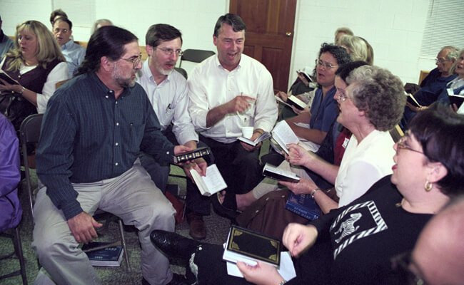 | David Lee leads a singing school in a private home as part of the Rocky Mountain Sacred Harp Convention, Boulder, Colorado, September 26, 2003. Photo by Laurie Kay Sommers, courtesy of South Georgia Folklife Collections, Valdosta State University Archives and Special Collections of Odum Library. |