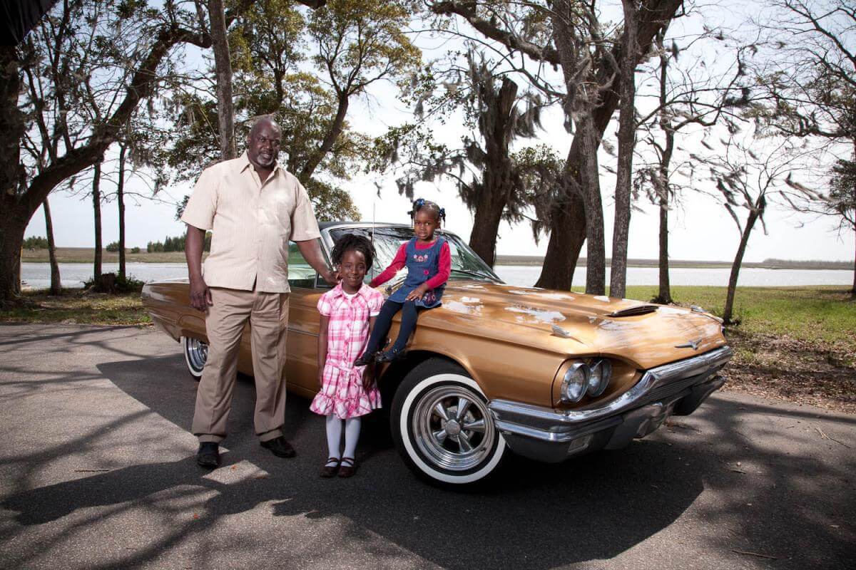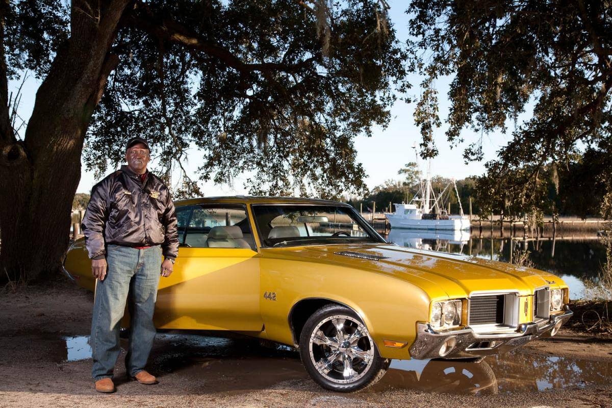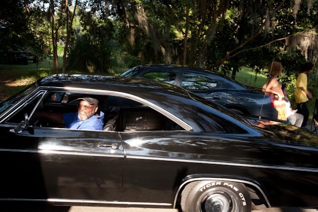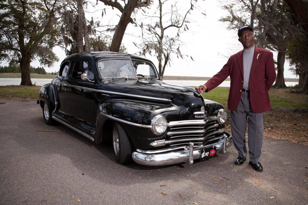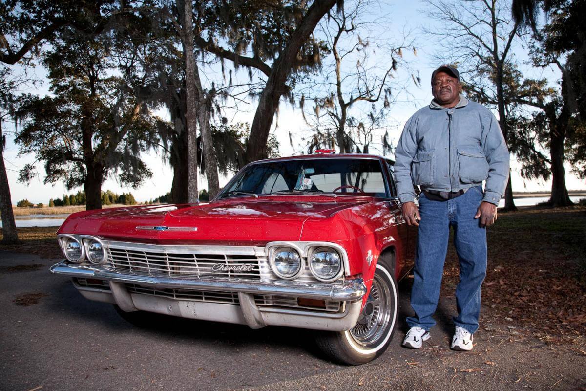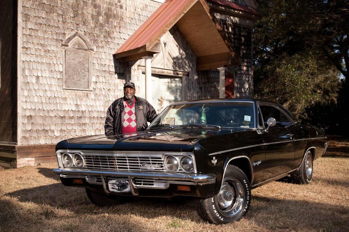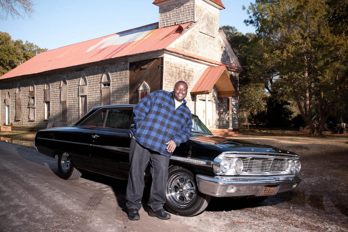 We wanted to photograph the members of the car club alongside their cars. They agreed. In exchange, each member would receive copies of the photographs. We worked in a straight-forward manner to best present the car and its owner. Car club members suggested locations for their significance in the local African American communities: Old Bethel A.M.E. Church, Buck Hall Landing, and Jeremy Creek in McClellanville, the Deer Head Oak, River Road near M&M Garage, Lincoln High School, and Thompson Hill Playground in Awendaw.