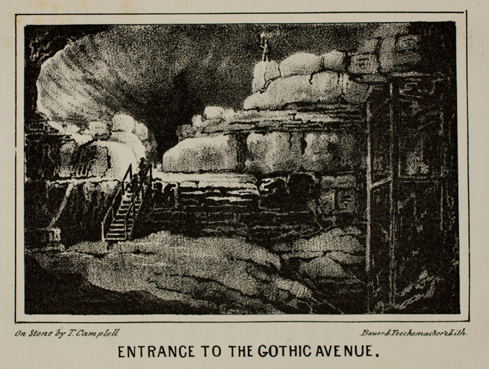 | Alexander Clark Bullitt, Chief City or Temple from Rambles in Mammoth Cave, 1845. Courtesy of American Antiquarian Society. | Alexander Clark Bullitt, Entrance to the Gothic Avenue from Rambles in Mammoth Cave, 1845. Courtesy of American Antiquarian Society. |