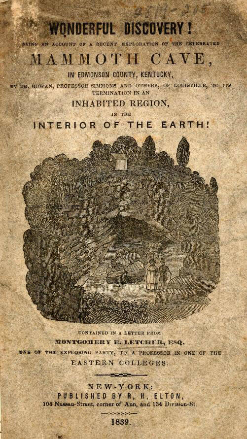 | 35. | "Wonderful Discovery!: Being an Account of a Recent Exploration of the Celebrated Mammoth Cave, in Edmonson County, Kentucky, by Dr. Rowan, Professor Simmons and Others, of Louisville, to its Termination in an Inhabited Region, in the Interior of the Earth!" (New York: R. H. Elton, 1839). Courtesy of the Wisconsin Historical Society. |