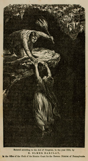 | Artist unknown, Esther's leap into The Bottomless Pit, from Startling Disclosures! Mysteries Solved! On the History of Esther Livingstone, and Dark Career of Henry Baldwin, 1853. Courtesy of American Antiquarian Society. |