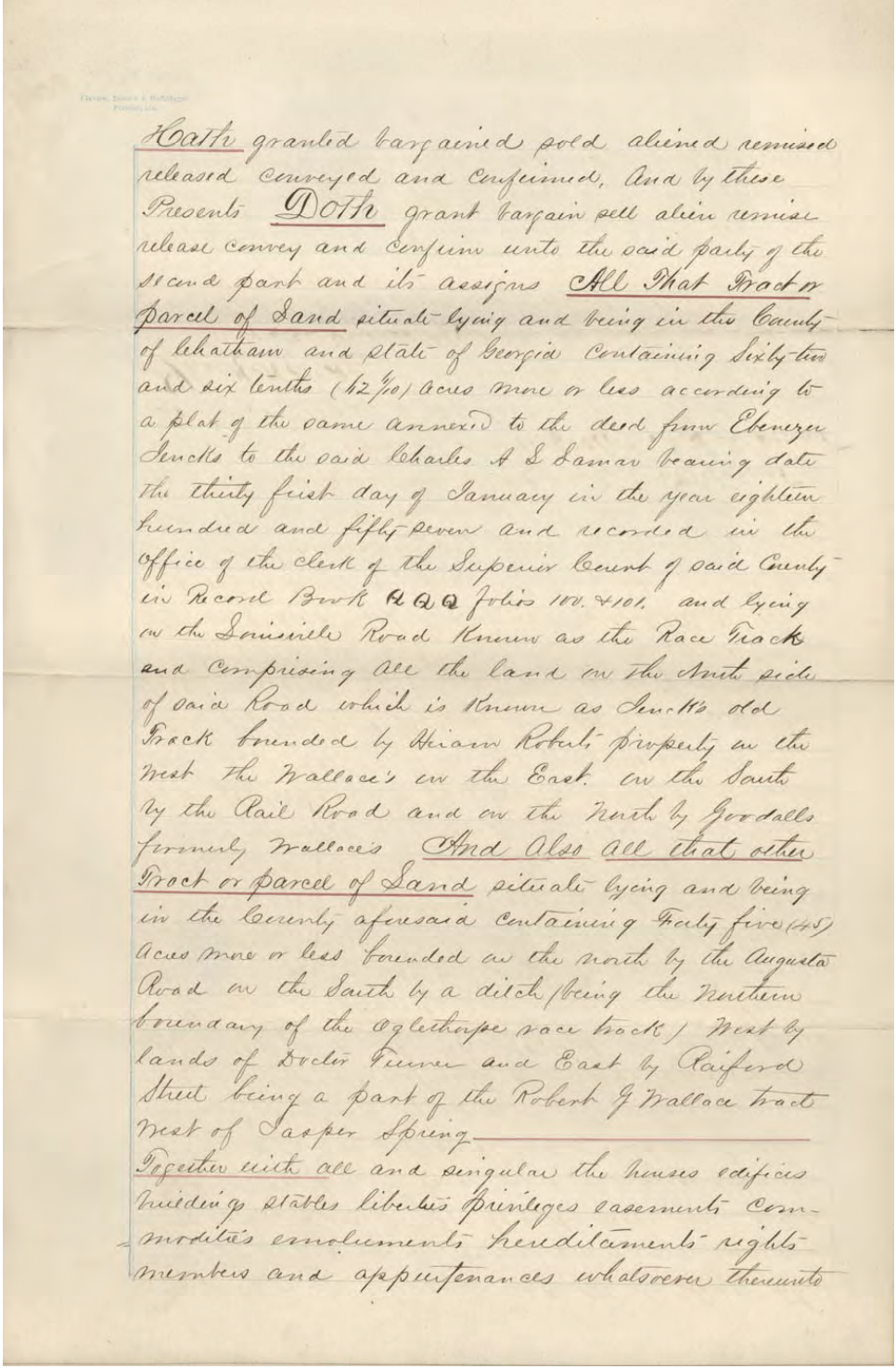 | 62. | Specifically, Caroline Lamar sold 62 6/10 acres adjacent to Louisville Road, and an additional forty-five acres south of Augusta Road, and north of "Oglethorpe's Race Track," to the Association, for eight thousand dollars. |