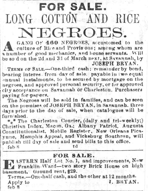 A Gang of 460 Negroes, accustomed to the culture of Rice and Provisions; among whom are a number of good mechanics, and house servants. Will be sold on the 2d and 3d of March next, at Savannah, by JOSEPH BRYAN. Terms of Sale—One-third cash; remainder by bond, bearing interest from day of sale, payable in two equal annual instalments, to be secured by mortgage on the negroes, and approved personal security, or for approved city acceptance on Savannah or Charleston. Purchasers paying for papers. The Negroes will be sold in families, and can be seen on the premises of JOSEPH BRYAN, In Savannah, three days prior to the day of sale, when catalogues will be furnished. *** The Charleston Courier, (daily and tri-weekly;) Christian Index, Macon, Ga; Albany Patriot, Augusta Constitutionalist, Mobile Register, New Orleans Picayune, Memphis Appeal, Vicksburg Southern, and Richmond Whig, will publish till day of sale and send bills to this office.