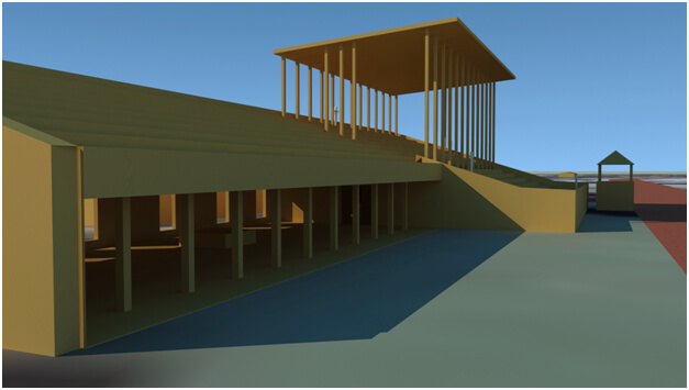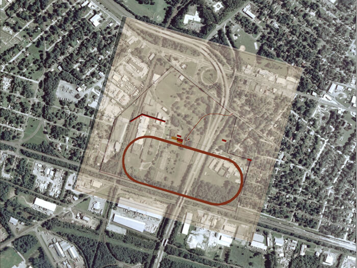 To depict the actual site of the sale, I worked with GIS specialist Michael Page, Geospatial Librarian, of Emory University, and Kyle Thayer, Emory graduate student in Computer Science, to create a composite map and attendant 3-D images at the culmination of this research project, using the aerial photographic software Google Earth, the computer-aided design software AutoCAD, and a three-dimensional design software, Lightwave. Initially, a racecourse meeting the specifications of Ten Broeck was drawn using AutoCAD. Track width and all pertinent dimensions, including the location of the finish line, were obtained with assistance from the Keeneland Equestrian Library in Lexington, Kentucky, and from Belmont Park, home of the New York Racing Association in Elmont, New York. The computer-generated racetrack, with attendant grandstand, was imported into a mapped contemporary image of the site area of the former racecourse. Ultimately, our composite map was created from interrogating and analyzing a historic plat of the Ten Broeck racecourse site, historic maps of Savannah and Chatham county, 1890s photographs of the Savannah Jockey Club members at the Ten Broeck Race Course, and a contemporary aerial photograph of the site.