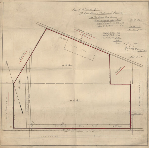 | Detail showing Ten Broeck Race Course location, from "Map of part of Chatham County, State of Georgia showing property lines in the environs of Savannah, from the latest surveys," 1897. | Plat of Ten Broeck Race Course site, Savannah, Georgia, 1907. Courtesy of Georgia Historical Society Archives. |