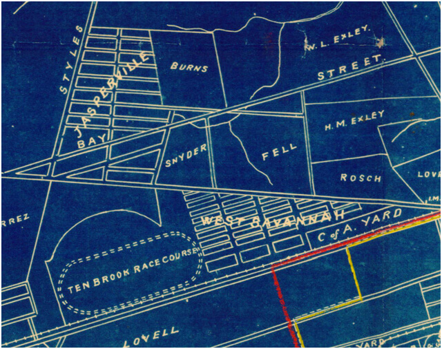A trip to the City Engineers' offices in Savannah yielded a map that most clearly shows the Ten Broeck Race Course. A detail from the Blandford map—created in 1890 after almost a decade of work by Texan Robert A. Blandford, under commission from the City of Savannah—corroborates the earlier maps found during this research and shows an oval track, the words "Ten Broeck Race Course," and importantly, the location of the grandstand—the lieu de memoire of the 1859 sale. The Blandford map locates the grandstand slightly west of center, adjacent the north section of the racetrack, and shows a pathway leading from east of the grandstand through entrance gates to Augusta Avenue.