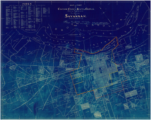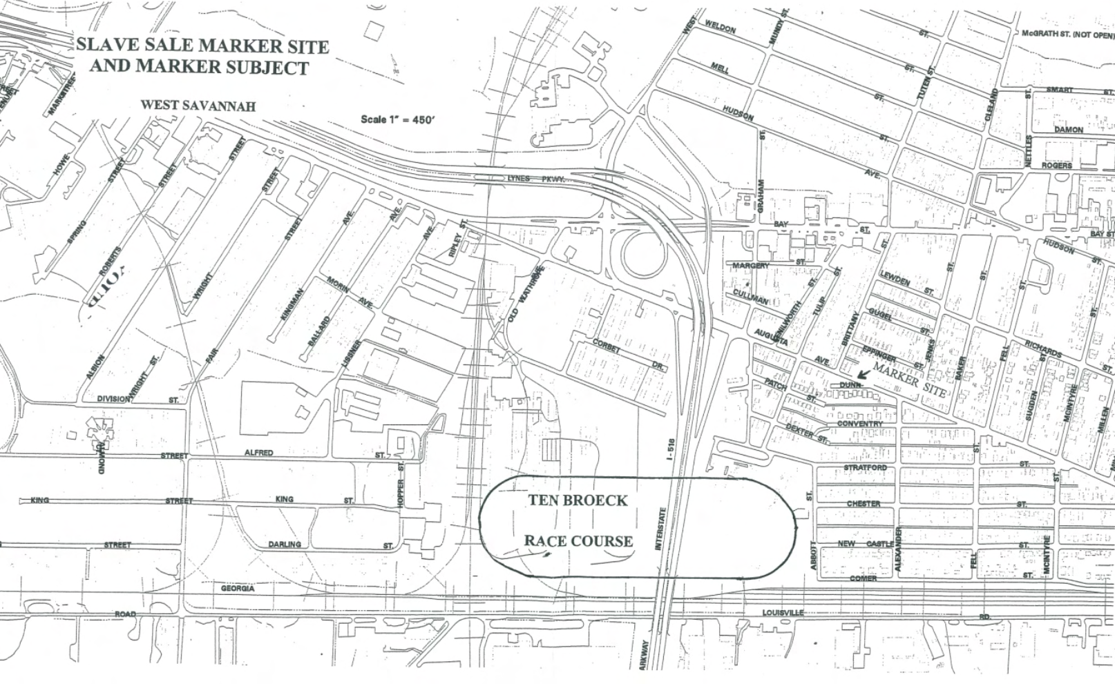 My research yielded graphic and textual information and led me to people who knew about the site's history through research and oral history. Research at Emory University's Manuscripts, Archives, and Rare Book Library (MARBL) and at the Georgia Historical Society (GHS) archives in Savannah yielded maps from the 1730s through the nineteenth century, documenting the site of the sale, including one that actually locates the Ten Broeck Race Course. At MARBL, I viewed maps of Savannah dating back to 1734, when the city was taking form. Georgia, a slave-free state at its inception, legalized slavery in the 1750s. Rice plantations flourished along the Savannah River. The city expanded its boundaries on all sides. With copies of maps in hand, I searched for the race course and the Central of Georgia Railroad, commissioned in the mid-1830s.50Thomas Gamble, "A History of the Municipal Government of Savannah from 1790 to 1901," in Report of Hon. Herman Myers, Mayor, Together With The Reports Of The City Officers Of The City Of Savannah, Ga., For The Year Ending December 31, 1900: To Which Are Added The Commercial Statistics Of The Port, Reports Of Public Institutions, Ordinances Passed During The Year 1900, And A History Of The Municipal Government Of Savannah from 1790 to 1901 (Savannah, 1901), 170–177. The Central of Georgia Company was organized in December 1833; however, exact dates for when portions of rail lines were constructed are sketchy. Gamble (1901) is an excellent, but tedious source. See also, Ron Wright, "History of the Central of Georgia Railway," Central of Georgia Railway Historical Society, http://cofg.org/index.php?option=com_content/&task=view&id=77&Itemid=43, accessed August 11, 2006.