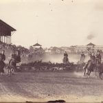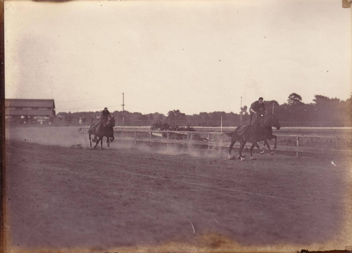 The palimpsest of near-faded and faint dashed lines amid bold city lines and plots excoriated in grid form show in this map alone, the nearly 140 years of Euro- and African-American settlement. Old trails, possibly used by American Indians, became the roads of colonial Americans; Augusta Avenue appears on very early Savannah maps as a trail. Images of several Savannah Jockey Club members from the 1890s, obtained from GHS, show the racetrack and structures: a covered grandstand to one side of the track, shed-like buildings on one side of the "turns" in the track, and smaller (likely timekeeper's) raised platforms. The 1872 Platen map shows two rectangular structures adjacent to the straight stretch of the racetrack, on the north side. These structures are most likely a seating grandstand and covered stables. Doesticks writes that prior to the slave sale, for four days while under inspection by buyers, and for two days during the actual sale, the enslaved were kept in sheds typically used for the horses. He mentions that the slave sale, however, took place in the grandstand:60Doesticks, "Great Auction," 14; for other details of the sale, see also Bell, and Berry, "'We'm Fus' Rate Bargain.'"