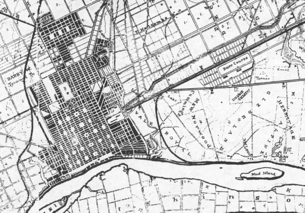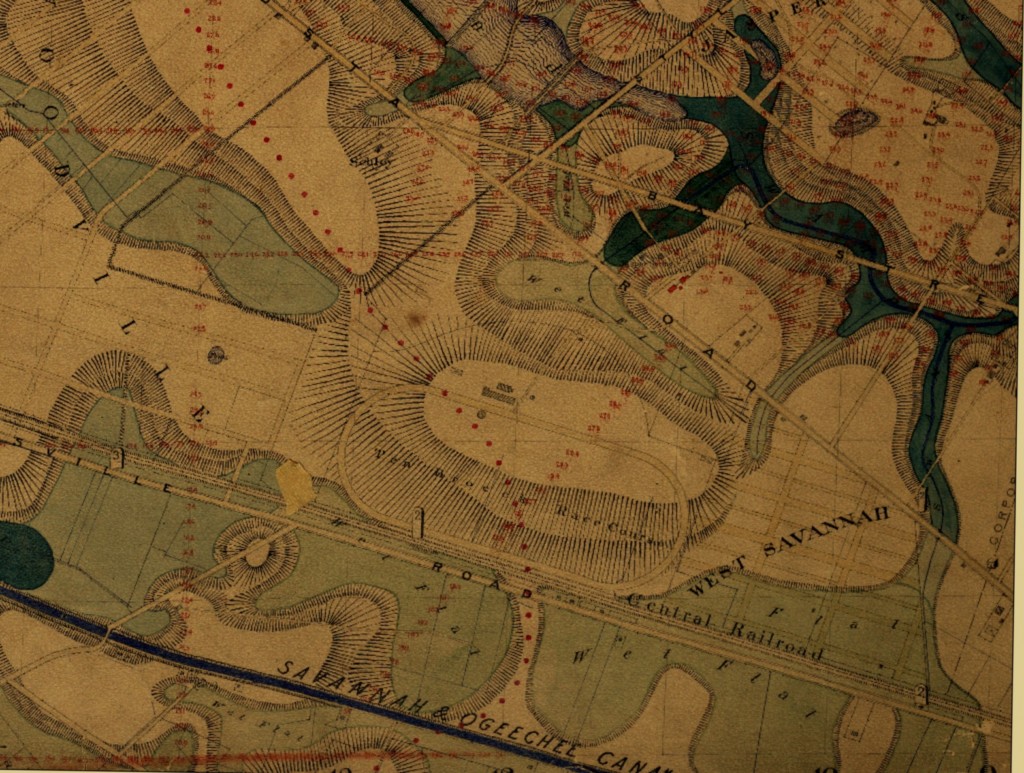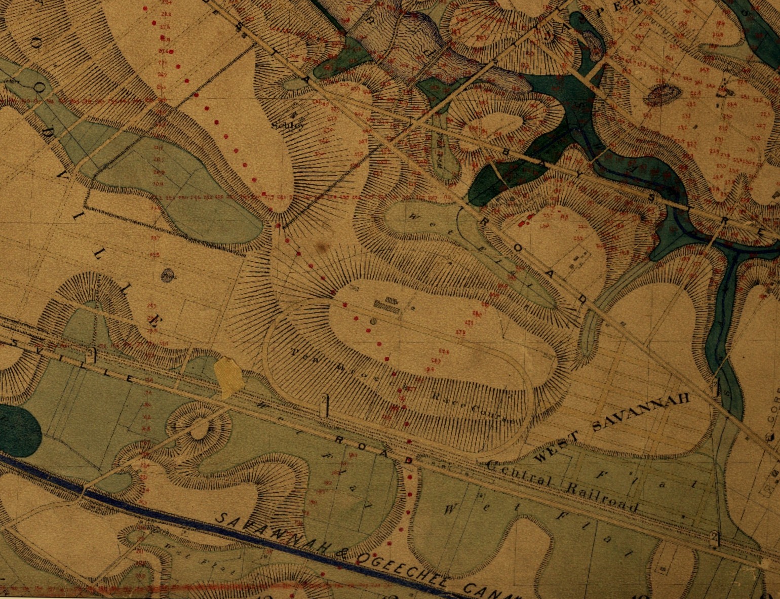 This excerpt from the Platen map shows a "Race Course" three miles west of Savannah, adjacent to the Central of Georgia. The Savannah River (and north) is to the bottom of the page. Louisville Road and the Central of Georgia tracks parallel each other as the dark central spine in the image (oriented south-west to north-east). Augusta Road is the diagonal that appends Louisville Road. That the race course is so clearly delimited is as exciting as the multiple cultural layers evident in the map. Former plantation names and attendant boundaries are inscribed, as are hydrologic features. Immediately adjacent to the Savannah River (bottom of image), the words 'Vale Royal,' 'Glebeland,' 'McAlpine,' 'Hermitage' and 'Retreat' are discernible; these were plantations.