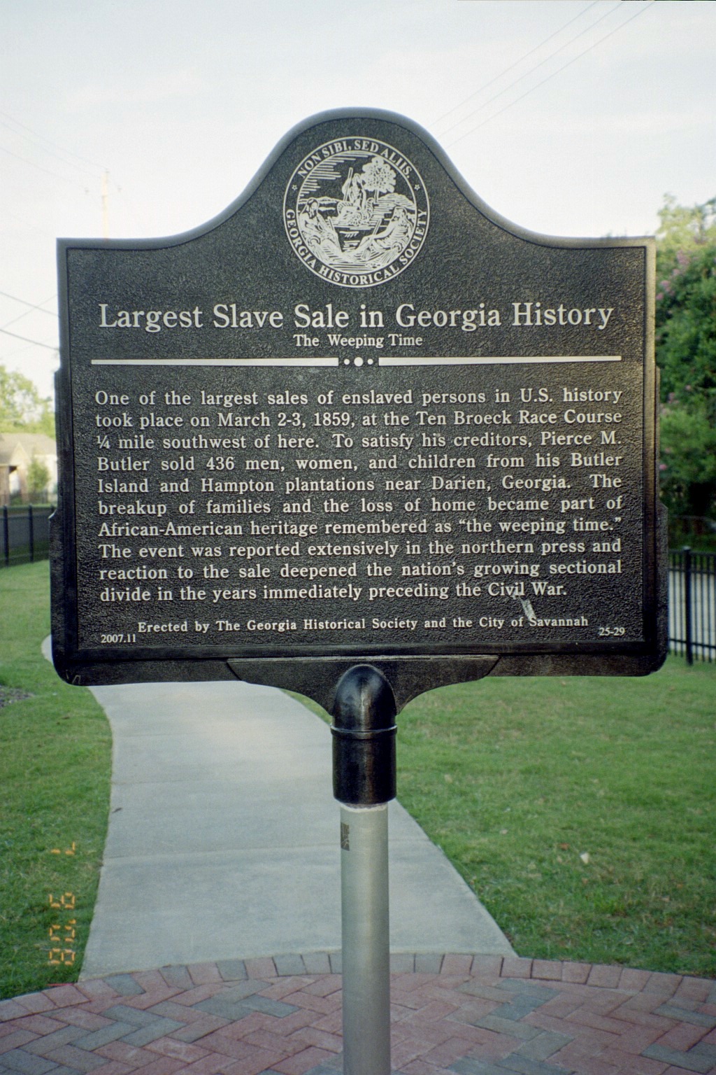 In 1859, one of the largest sales of enslaved people in US history took place at the Ten Broeck Race Course, now an obscured landscape, on the outskirts of Savannah, Georgia. At the behest of Pierce Mease Butler (1810–1867), 429 enslaved persons from the Butler plantations near Darien were sold in an event known and remembered as "The Weeping Time."