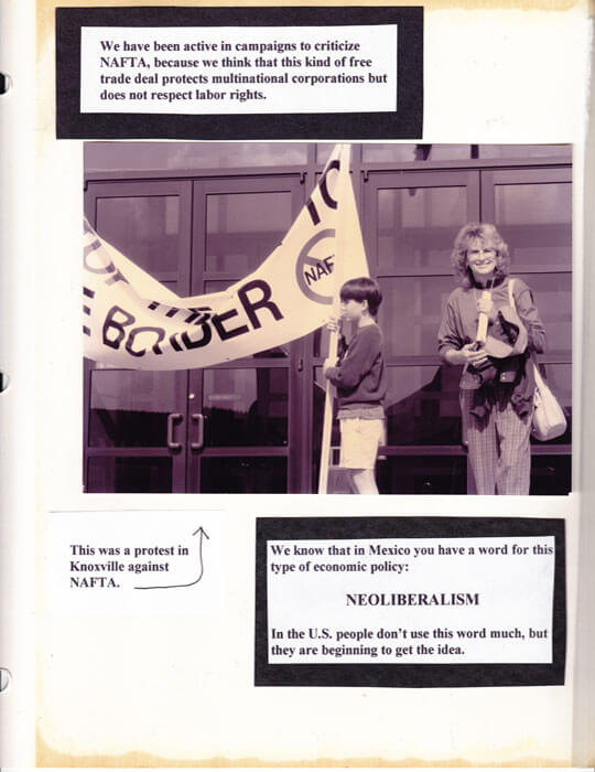 TIRN found that despite its commitment to building cross-border solidarity, it was difficult to maintain active ties with host groups and individuals in Mexico. In 1997, a committee decided to experiment with a scrapbook exchange between women factory workers in east Tennessee and women maquila workers in Juárez. Another worker-to-worker exchange idea resulted in a popular education tool, Morristown Video Letters, an edited selection of interviews with Tennessee and Mexican workers, with voice-over translation into both English and Spanish. TIRN hoped these letters might serve to support on-going dialogue.13Morristown Video Letters is available on DVD, in English and Spanish versions, from the Highlander Research & Education Center.