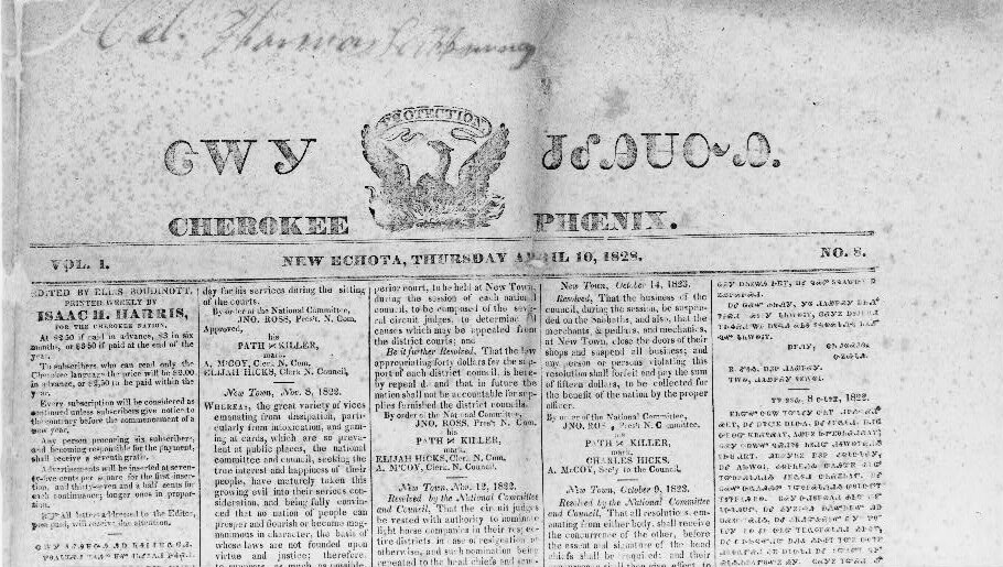Cherokee Phoenix, New Echota, Georgia, April 10, 1828, Library of Congress, 97512373. Text from the article Atrocious Injustice, May 18, 1833, is available from the Sequoyah Research Center.