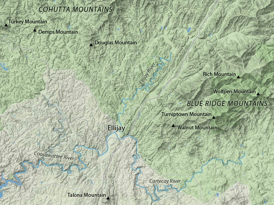 The significance of Ellijay to the story of removal from Georgia emerges in part from geography. In each of its elusive locations Ellijay was a mountain town. Just fourteen miles from the North Carolina line, Georgia’s Ellijay lies in an elevated valley south of two mountain ranges, the Blue Ridge and the Cohuttas. Peaks of two to four thousand feet arc skyward around and beyond the town. In the Blue Ridge to the northeast Turniptown, Rich, and Wolfpen Mountains rise some four thousand feet while the eastern Owltown and Walnut Mountains ascend twenty-one to twenty-six hundred feet. From the Cohuttas north and west of Ellijay, summits called Douglas, Demps and Turkey Mountains reach elevations of up to twenty-five hundred feet. Talona Mountain to the south is approximately two thousand feet high. Such enduring and demanding landforms shaped the lives of Cherokees who lived among them and secluded them, initially, from white settlement. Mountain Cherokees were the least familiar and most discomfiting to Georgians.