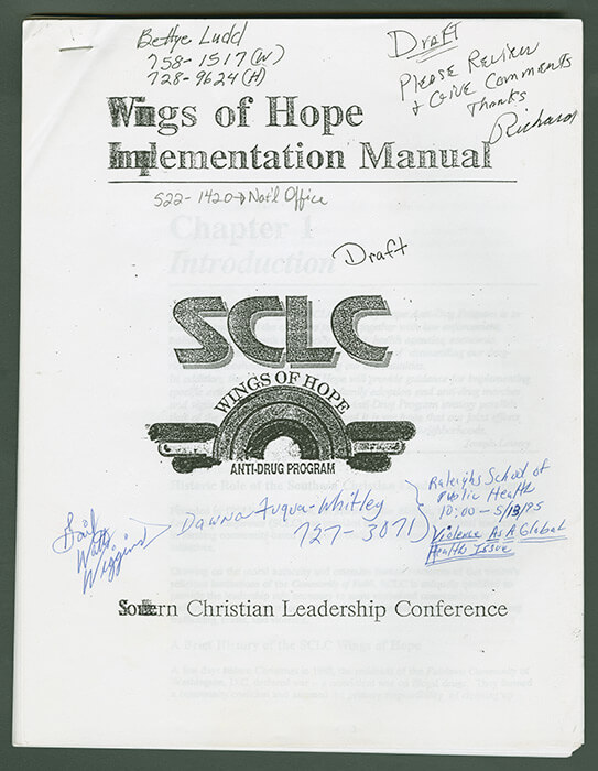 | Draft of Wings of Hope Implementation Manual, circa 1995. Courtesy of SCLC records, MARBL, Emory University. |