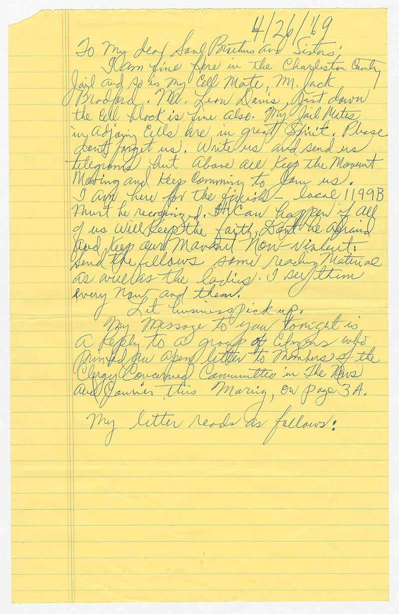 | Selected page from Ralph David Abernathy's Letter from a Charleston Jail, April 1969. Courtesy of SCLC records, MARBL, Emory University. |